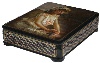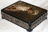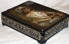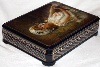 The box is constructed from paper-mache. Black lacquer is used to paint the exterior of the box while red lacquer completes the interior of the work. The lid is hinged from the left of the portrait, and the box rests on four legs. The work is signed with the artist's name, Fedoskino, the year of 2008, and the title.