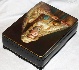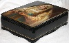The box is made out of paper-mache. Black lacquer covers the exterior and red lacquer covers the interior of the box. The box has a hinge from the left of the scene, and rests on a flat bottom. The work is signed by the artist.