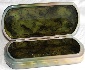 The box's interior imitates the color of green marble (dark green veins and blurry spots are scattered against the olive background). On the box's interior bottom the artist has written his name, and drawn several dew drops. A shining gold metal thread wraps around the box's sides.