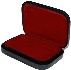 The box is constructed out of paper-mache. Black lacquer covers the exterior and red lacquer covers the interior of the box. The box has a hinge from the top of the scene, and rests on a flat bottom. The box is signed by the artist.
