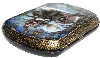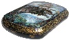 The box shows an episode from the fairy-tale "Ivan Tsarevich and the Grey Wolf". Here we can see Ivan Tsarevich and Princess Elena sit on a Grey Wolf while he is jumping over the towns and the villages. Mother-of-pearl shines through the Princess's dress, the sky and the moon that is crafted three-dimensionally. Gold metal leaf creates brilliance of the firebird, the cage, some of the cupolas of the depicted churches and ornaments on the characters' clothes. The scene is painted in blue oils mixed with aluminum powder. Blue and grey oils mixed with aluminum powder also cover the box's exterior. For additional decoration the blue-silver surface of the box's exterior is studded with gold blurry spots. On each of the box's sides the artist has painted a swallow.