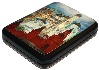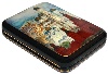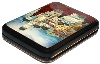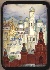 A large shining piece of mother-of-pearl is set into the center of the composition to attract light to the brilliantly painted medieval architecture. Radiance of the cupolas in the sun is achieved with the help of gold powder. Silver powder is used to highlight the square and some parts of the architecture. The scene is framed with a gold line. Two parallel gold lines can be found wrapping around the box's sides.