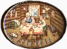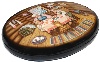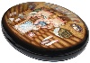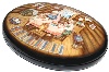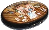 Description: Tatiana Levko is the talented Fedoskino artist who has been able to represent vividly the interior of a traditional Russian peasant house on this large oval box. In the center of the composition we can see a kind granny who offers tasty pies and sweet tea to her grandchildren. There is a shining golden samovar on the small stool in front of the table. The floor is covered with handmade carpets. From the left of the central scene the artist depicts the big chest where granny keeps her clothes and the mirror hanging on the wall. From the right of the central scene we can see the wooden bench and the red corner that is the most important element of the traditional Russian peasant house.