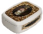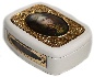 The painting of a Russian Merchant daughter in a costume of 19th century is done on the shining pearl surface. The scene is encompassed with a REAL gold-covered metal frame. The sides of the box is also decorated with pieces of mother-of-pearl, but different colors!