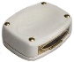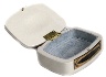 The box is constructed from paper-mache. The exterior of the piece is painted with a creamy white lacquer while the interior is covered with a beige velvety material. The lid is hinged from the top of the composition and the box rests on four small, rounded gold metal legs. The work is signed with the artist's name and the village of Fedoskino.