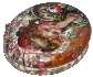 The palette is rich but the predominance is given to various shades of bright red and white oils. Gold metal powder is mixed into oils to enhance some elements of the composition. The painting is spread on the box's lid and the bottom of it fully decorated with an apple tree full of tasty red apples.The box's interior has a painting of a Hedgehog laying on his back and showing his small legs.