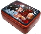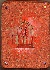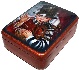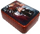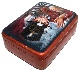 The box is constructed from paper-mache. Carrot-red lacquer mixed with gold powder is used to paint the exterior of the piece while the dark red lacquer completes its interior. The lid is hinged from the left of the scene, and the box rests on four little beads glued to the bottom of the box. The work is signed with the artist's name and the title on the box's reverse side.