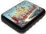|                 |  |  This beautiful view of the Moscow Kremlin has been painted by Vladimir Monashov who specializes in painting the architecture of Moscow. In the foreground he depicts the embankment of Moskva River. The central part of the composition shows the red- bricked Kremlin's wall. From left to right we can see the following towers of the wall: the Vodozvodnaya Tower, the Blagoveshchenskaya Tower, the Tainitskaya Tower, the First Bezymyannaya Tower, the Second Bezymyannaya Tower, the Petrovskaya Tower and the Moskvoretskaya Tower. Behind the Kremlin's wall we can see (from left to right) the Great Kremlin Palace, the Archangel Cathedral, the Belfry of Ivan the Great and the Assumption Bell Tower. In the far background the artist has painted the St. Basil's Cathedral.The composition is painted in the realistic style using various tones of oils. The palette is enhanced by silver metal powder and mother-of-pearl inlay. Silver metal powder shines through the architecture of the Kremlin's wall, the Moskva River' water, and also is used to highlight the clouds in the sky and the trees. Mother-of-pearl is inlaid in the central part of the composition where the Archangel Cathedral and the Belfry of Ivan the Great are painted.