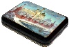 The box is constructed from paper-mache. Black lacquer is used to paint the exterior of the box while red lacquer completes the interior of the work. A hinge is fastened to the top of the composition, and the box rests on a flat bottom. The work is signed with the artist's name, the year of 2009 and the village of Fedoskino.