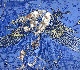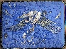 The composition is painted in blue tones of oil paints. Different details are enhanced by bright gold and silver paint.