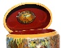 The box is constructed from paper-mache. The lid is hinged from the top of the scene and the box rests on four glass beads. The work is signed with the artist's name, the title, Fedoskino and the year of 2011 on the oval piece of mother-of-pearl glued to the box's interior bottom.