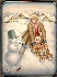 It features peasant father and a kid going to sledge down the snowy hill and stayed at the figure of a snowman . Father and a Kid are dressed up in winter fur coats. Their faces has a rose shade after being for a while at the winter open air. Snowman has a bucket on his head as a hat and a red carrot as a nose. The surrounding winter landscape is painted in white and light blue tones. We can see the village houses with a snow-covered roofs on the background on the composition.