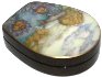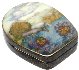 The scene is thinly outlined in gold. The painting is framed with a gold line. An intricate gold tartan pattern decorates the box's sides.