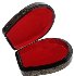 The box is constructed out of paper-mache. Black lacquer covers the exterior and red lacquer covers the interior of the box. The box has a hinge to the left