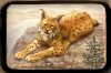 The composition is painted in gray, brown and yellow tones. The lynx is laying on the stones and the painting is very much detailed.