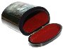 The box is made out of paper-mache. Black lacquer covers the exterior and red lacquer covers the interior of the box. The lid is hinged from the top of the composition and the box sits flat. The work is signed by the artist.