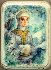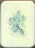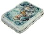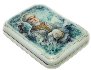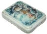 The scene is painted in blue oils against the white background. Silver and gold powders help to accentuate richness of the woman's costume. The edges of the lid are decorated with an elegant pattern composed of gold beads. On the box's exterior bottom the artist has painted one more scene in oils that shows a tree covered with snow.