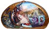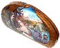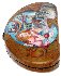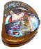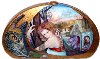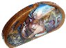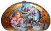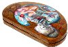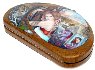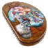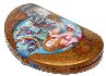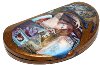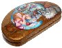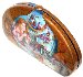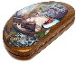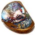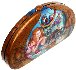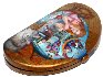 The composition is painted in bright oils. Gold metal paint is used to decorate the box's exterior with lustrous, wide bands running along the box's sides.