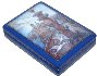 The box is made out of paper-mache. Blue lacquer covers the exterior and red lacquer covers the interior of the piece. The lid is hinged from the left of the scene, and the box rests on a flat bottom. Signed with the artist's name, the village Fedoskino, the year of 2008, and the title " St.Petersburg,Rostral Column, a view to the Peter and Paul's Fortress " on the bottom's exterior of the box in gold.