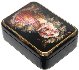 The scene is painted in light brown oils against the black background. Black lacquer covers the box's exterior while the interior is traditionally covered with red lacquer. Composition and the edge of the box's base are decorated with rich golden lines.