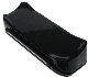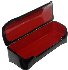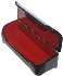 The box is constructed out of paper-mache. Black lacquer covers the exterior and red lacquer covers the interior of the box. The box has a hinge from the top of the composition, and rests on wavy legs. The work is signed with the artist's name.