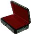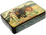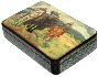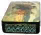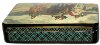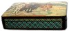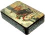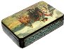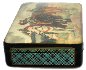 The box is constructed from paper-mache. Black lacquer is used to paint the exterior of the box while red lacquer completes the interior of the work. The lid is hinged from the top of the composition, and the box rests on four legs. The work is signed with the artist's name, the year and the village of Fedoskino.