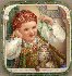 Here we can see a young girl dressed in Russian costume playing with a kitten at the windows.
