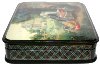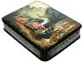 The box is constructed from paper-mache. Black lacquer is used to paint the exterior of the box while red lacquer completes the interior of the work. The lid is hinged at the top, and the box rests flat. The box is signed with the artist's name, the village of Fedoskino, and year of 2002 at the bottom of the scene.