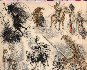 The scene is mostly painted in contrast oils-blacks on white.The artist masterfully used golden foil and golden paint to richly highlighted the details of the characters.