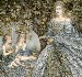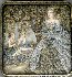 The palette incorporates brown and gray oils as the action takes place in fall, with addition of gold and silver metal paints to give a feeling of magic and splendor. The artist demonstrates his unsurpassed skill while painting Mom's festive attire. Painting with an ultra fine brush, he creates exquisite gold lace texture of her dress. The branches of apple tree covered with gold, that are also expressively painted, shine in some places with lustrous silver paint.The painting is done over several pieces of mother-of-pearl!