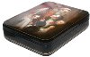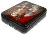 The box is constructed from paper-mache. Black lacquer is used to paint the exterior of the box while red lacquer completes the interior of the work. A hinge is fastened to the left of the scene, and the box rests on legs. The work is signed with the artist's name and Fedoskino 2012.