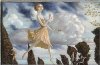 The box shows a young beautiful girl going across the park. The wind is waving her peach-colored dress, two people are discussing something at the bench and one is walking around the tree on the background. And ,of course, we can not fail to attend endless skies on the background and a large figure of a lion there.