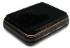 Composition is framed with a gold line. Two gold lines are wrapping around the box's sides. The interior is traditionally covered with red lacquer, while exterior of the box is painted black.