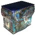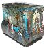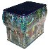 The box is constructed from paper-mache. The lid is hinged from the top of the painting, and the box rests on four legs.