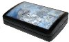 The box exterior is covered with dark blue lacquer and decorated with metal gold and silver shapes cut out of gold and silver metal foil, and glued to the box manually(so called "scan"). Its interior is traditionally red.