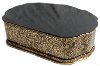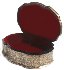 The box is constructed from paper-mache. The exterior of the box is black painted, while red lacquer completes it's interior. A hinge is fastened to the top of the scene, and the box rests flat. The work is signed with the artist's name, the title (Masquerade), and the village of Fedoskino.