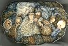 The whole composition is richly decorated with several pieces of mother-of-pearl! One piece is "hidden" under the fan of a lady, the other one is in her dress, one more in the mask of a lady to the left and the last one is in the tambourine of Jester.