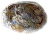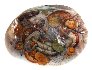 To paint this work the artist has used various shades of brown oils, and gold metal paint as an underlayer for the oils. A large piece of mother-of pearl is used as a top of the installation.