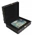 The box is constructed from paper-mache. Black lacquer is used to paint the exterior of the piece while deep red lacquer completes the interior of the box. A hinge is fastened to the top of the composition, and the box rests flat. The work is signed with the artist name, village of Fedoskino and dated (2019) at the bottom of the composition.