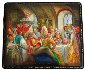 Artist has wonderfully entwined the realism of Makovskiy with the magical beauty of Fedoskino miniature. She has mixed brightly colored oil paints with crushed mother-of-pearl that shines through the areas where the windows are depicted. Gold metal leaf, bright silver and gold paints help to accentuate richness of the characters' costumes. Gold and silver paints are also used to highlight the crockery. The wispy veil of the bride has been depicted with transparent paints, and hundreds of individual brush strokes make up the fur of the nobles' coats in the foreground. Shading and color variation, although not readily noticeable, add tremendous realism to the composition. The artist has taken advantage of the original positioning of each of the characters facing the newlyweds, and has painted each face with extreme life-like detail and expression.