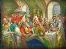 The composition depicts one of the most important social and political events of old Russia, a wedding uniting two families of the powerful boyar class that dominated Muscovite politics in the sixteenth and seventeenth centuries. The artist has singled out that moment during the wedding feast when the guests toast the bridal couple with the traditional chant of "gor'ko, gor'ko," meaning "bitter, bitter," a reference to the wine, which has supposedly turned bitter. The newlywed couple must kiss to make the wine sweet again (this tradition continues even today)! The toast occurs towards the end of the feast when a roasted swan is brought in, the last dish presented before the couple retires.