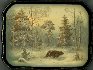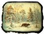 Description: Talented Fedoskino artist Mikhail Buzovkin has painted this interesting composition with a big brown bear in the Winter forest.