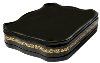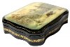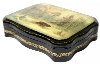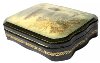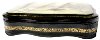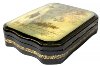 The painting is framed with a scrolling pattern painted in gold, the box's sides are decorated with more intricate gold ornamentation. The interior is covered with red lacquer, while exterior is painted black.