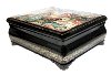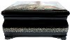 The box is made out of paper-mache. Black lacquer covers the exterior and red lacquer covers the interior of the box. A hinge has been fastened to the top of the composition, and the box rests on four legs. It is signed with the artist's name, the village of Kholuy, the of year 2015, and the title. The artist has written the same on the interior of the lid.