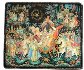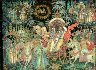 The composition shows the scenes from the memorable tale of, "The Golden Cockerel", written by Alexander Pushkin. It is the defining three moments, but on the major and main view we can see a moment when Tsar Dadon comes back to his kingdom with the bride he is to marry. She is the Queen of Shemakha, whose beauty has blinded the weak tsar and made him forget about the important things in life. The end of the tale is tragic: Tsar Dadon is punished for his cruelty.