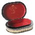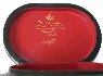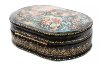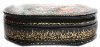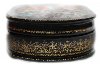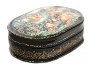 The box is constructed out of paper-mache. Black lacquer is used to paint the exterior and red lacquer is used to paint the interior of the box. The box has a hinge located above the composition and rests on four small round legs.