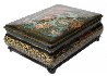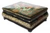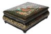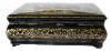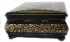 The edges of the lid and its sides are decorated with beautiful patterns painted in gold and in silver. The exterior of the box is painted with black lacquer while the interior is completed with red lacquer.
