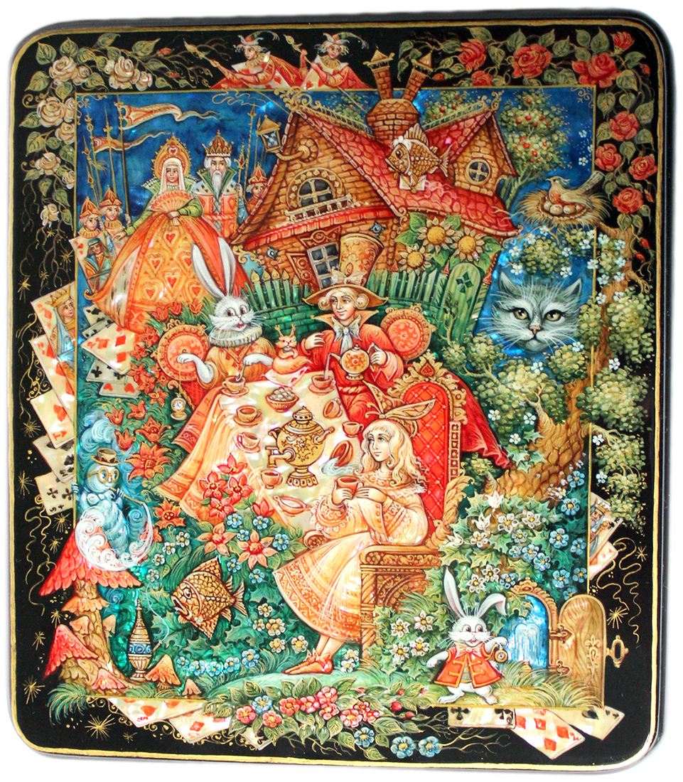 Description: Well-known prominent Kholui artist, Kovaleova Svetlana, has painted this complex multi-figured composition that depicts the gathering of characters from Lewis Carroll's classic tale "Alice in Wonderland".