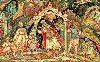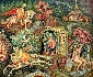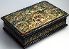 Description: This marvelous box has been painted by the outstanding Kholuy artist Nikolay Galda. Its subject is based on the thrilling Russian fairy-tale "The Apples of Youth and the Water of Life". The old Tsar dreams of returning him youth and being young again. He sends his three sons to carry him the golden apples and the water of life. With the help of the golden apples, he hopes to become young again, and with the help of the magic water, he intends to heal his poor eyesight. Having been tempted and deceived by a wicked maiden, the elder brothers are taken prisoner, while their young brother Ivan Tsarevich manages to fulfill this task. Here the artist has depicted a wonderful assembly of scenes from this tale to acquaint the viewer with its plot as well as possible. In the left upper corner of the composition we can see three scenes showing the beginning of the story. The first scene shows the tsar sending his sons to fetch the magic apples and water; while the second and the third ones show how two elder brothers have been deceived by the wicked maiden. She tempts them to eat delicious food and rest on the big soft bed. When they fall asleep, she turns over the bed, and they fall into a deep cellar, and have to spend the rest of their lives in captivity. In the upper right corner of the composition the artist depicts several scenes showing the adventures of the youngest son, Ivan Tsarevich. He gallops through the thick forest and comes across the shabby hut where Baba-Yaga lives. With the help of Baba-Yaga and her sisters, Ivan finds out the place where the magic apples grow and where the stream of magic water flows. In the middle of the composition there is the scene showing how Ivan Tsarevich steals the apples of youth from the garden of the incomparably beautiful Blue-Eyed Maiden, while she and her servants are sleeping. Then we should again look on the right side of the composition where the scene showing the Blue-Eyed Maiden taking a steam bath is depicted. Having discovered the loss of her apples, she decides to punish the thief and starts pursuing Ivan Tsarevich. Baba-Yaga and her sisters contrive different methods to detain her: one of them offers her to drink milk, the other one offers her to eat pancakes and the third one offers her to take a steam bath in the bath-house. A little lower from this scene, the artist depicts the tent with Ivan Tsarevich and the Blue-Eyed Maiden sitting inside it. Having run down Ivan Tsarevich, the Blue-Eyed Maiden starts fighting with him, and almost defeats him, but, suddenly, Ivan says: "Don't kill me! You'd better kiss me!". The Blue-Eyed Maiden kisses Ivan Tsarevich and falls in love with him. After that they set up the tent in the wide field and start feasting. In the right low corner of the composition there is the scene showing Ivan Tsarevich flying on the back of the huge bird. This is nearly the end of the story. Before carrying the youth-giving apples and the magic water to the old Tsar, Ivan determines to save his brothers, and successfully does it. Being envious and ungrateful, his brothers decide to kill Ivan. They want to receive a half of the kingdom from their father as a reward for fetching the magic water and apples. So, they push off Ivan Tsarevich into the abyss. At the bottom of the abyss Ivan finds nestlings that are more dead than alive. Heavy shower and strong wind have almost killed them. Ivan covers them with his jacket and saves them. To return his kindness, the huge bird Nagay, the mother of the nestlings, saves Ivan and carries him to his native kingdom. In the left low corner of the composition we can see the scene showing the unmasked elder brothers. They have fallen to their knees before the old tsar and entreat him to excuse them for killing their youngest brother Ivan. The Blue-Eyed Maiden has forced them to admit their guilt. She has set up the tent in the wide field, not from the old tsar's kingdom, and started waiting for Ivan Tsarevich, the father of her children. But Ivan Tsarevich doesn't come, and she decides to wage war against the tsar's army. The tsar is very frightened and forces his elder sons to find Ivan, and only then they confess to the crime that they have committed. And at last, in the middle, at the bottom of the composition we can see the scene showing the end of the story. Ivan Tsarevich approaches the tent where his wife, the Blue-Eyed Maiden, is waiting for him. His two little sons lead him by the hands to his incomparably beautiful wife.
