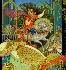 Besides the main characters of the story including the Sleeping Princess, Prince Yelisey, several inhabitants of the kingdom that also are fallen asleep, the artist also depicts the spindle in the right bottom corner, the crescent surrounded with stars in the upper left corner, the image of a loving couple on the blue sky at the top of the composition that is the symbol of love, and the beautiful fairy tale landscape.